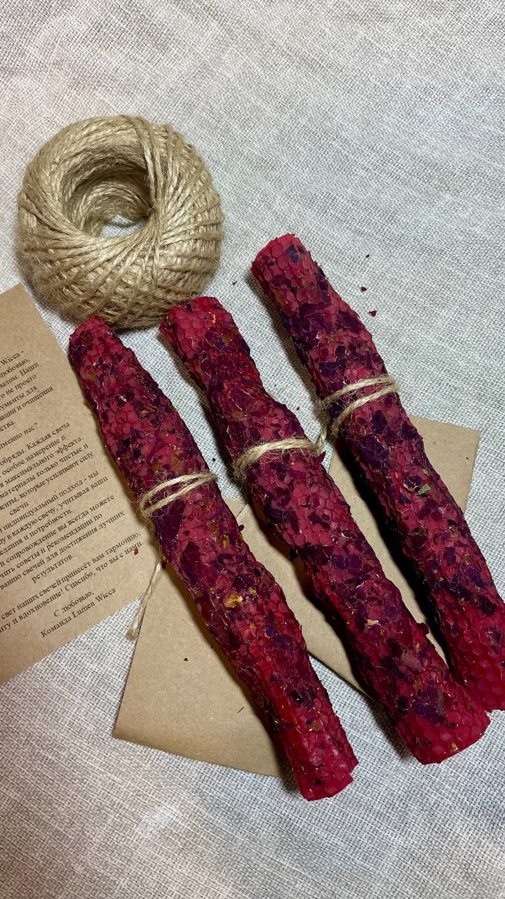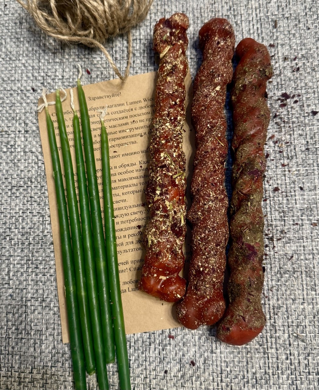В набор входят три свечи: • Чистка любовного канала — очищает от эмоциональных блоков (лаванда, жасмин). • Раскрытие женственной мягкости — раскрывает нежность и притягательность (жасмин, роза, пионы). • Притяжение любви — усиливает страсть и магнетизм (пачули, роза, мята).